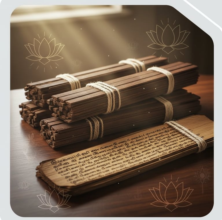 These were not ordinary records. Each leaf was treated as sacred, infused with mantra, prayer, and intention before being engraved in ancient Tamil script. Stored in temple sanctuaries, the manuscripts were regarded as living guardians of destiny rather than static texts.